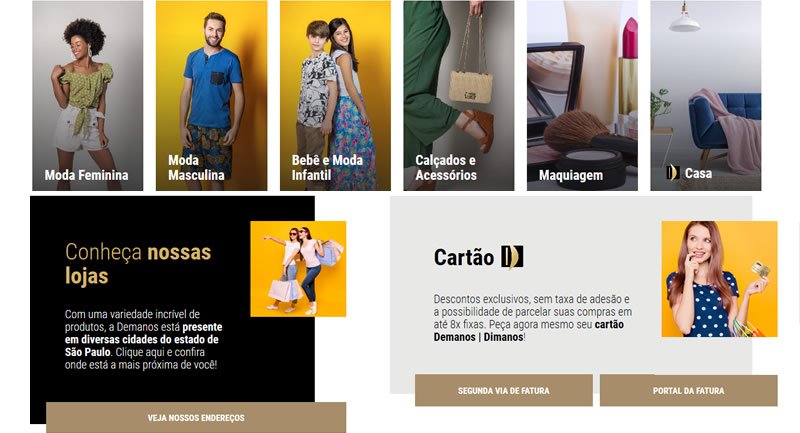 Se houver alguma dúvida relacionada com o cartão de crédito da loja ou com a fatura, entre no link https://demanos.com.br/cartao-d/ e veja a lista de dúvidas básicas que a loja responde. Nesse link, também é possível ler o regulamento para o uso do cartão da loja.